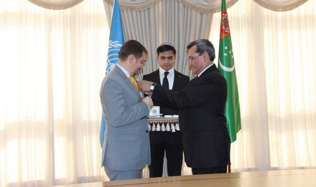 Награды получили Постоянный координатор ООН в Туркменистане Дмитрий Шлапаченко и Постоянный представитель Программы развития ООН Нарине Саакян.
