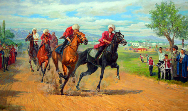 Центральное место занимает работа Байрама Мамиева «На свадьбе», где вместо праздничного кортежа показаны скачущие всадники, подчёркивающие народный обычай проведения конных состязаний. Среди дизайнерских работ выделяется картина Айгуль Гурбанмурадовой «Воспевание Родины», в которой два ахалтекинских коня — белый и чёрный — символизируют день и ночь.
