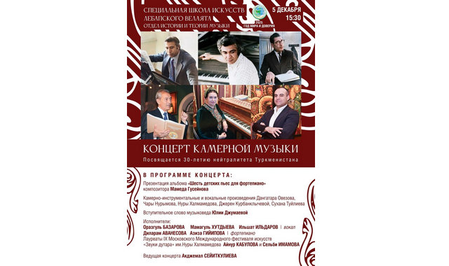 5 декабря в Лебапской специальной школе искусств состоится концерт камерной музыки, посвящённый 30-летию постоянного нейтралитета Туркменистана. Об этом сообщает новостной интернет-ресурс AsmanNews.