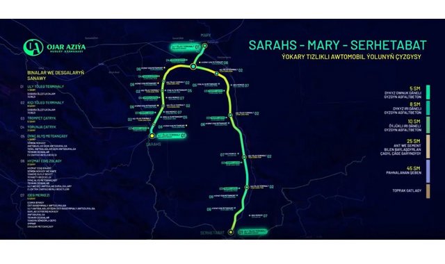 Холдинг «Ojar Aziya» планирует реализовать инвестиционный проект по строительству скоростной автомагистрали Серахс–Мары–Серхетабат протяжённостью около 450 км с подъездными дорогами длиной примерно 35 км, сообщает «Бизнес Туркменистан».