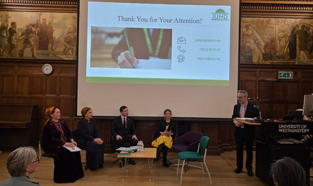 Также состоялась международная конференция, посвященная 35-летию независимости Туркменистана. В ней приняли участие представители Вестминстерского университета и делегация Международного университета гуманитарных наук и развития. Ректор М.Кулиева выступила с презентацией о внешней политике Туркменистана, основанной на постоянном нейтралитете. Преподаватель А.Чариев рассказал о истории страны, современных достижениях и образовательном сотрудничестве. Г.Сейилбаева представила опыт преподавания иностранных языков и работы университета в этой сфере.
