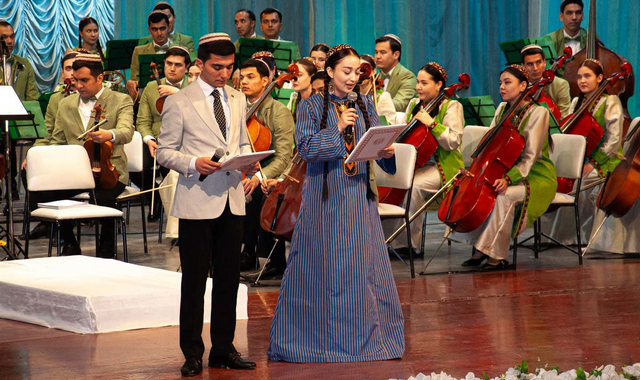 Завершился концерт исполнением кантаты «Dowletli döwran» на стихи Атамурата Атабаева. В исполнении участвовали симфонический оркестр, хор консерватории и солисты.